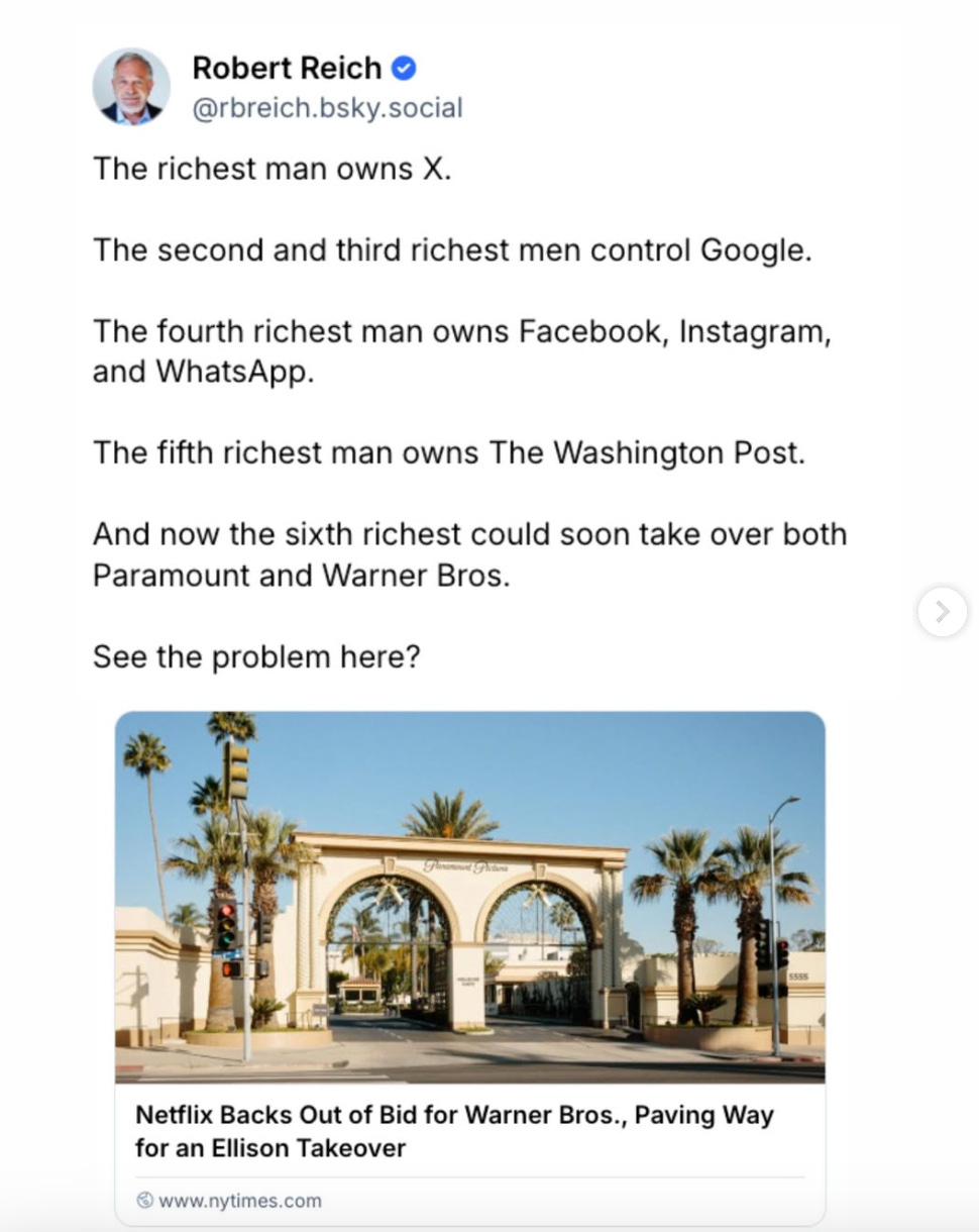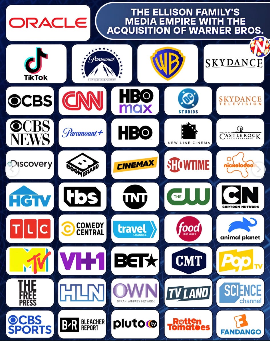 The landscape of entertainment and news just shifted forever in a negative way. As if struggling with disinformation in the United States media landscape wasn’t hard enough, the Trump friendly Ellison family - after a relentless pursuit of buying Warner Brothers in a battle with Netflix, for $111 Billion with the help of Arab Sovereign Funds no less - has swallowed up a large piece of the American media landscape. Shortly after its destruction of CBS and installing an extremely problematic and unqualified Bari Weiss as its Editor-in-Chief of CBS News, the mass exodus of journalists and producers from the network was inevitable, as the obvious path of mess the Ellison’s create raises big concern for the future. Similarly, Larry Ellison being a key investor in the new U.S.-based entity controlling TikTok, saw obvious censoring on the social platform, not missed by users. This was especially concerning as through his AI company Oracle, he has openly advocated for a widespread, AI-powered surveillance state, arguing that constant monitoring by cameras and artificial intelligence will ensure citizens are on their "best behavior".